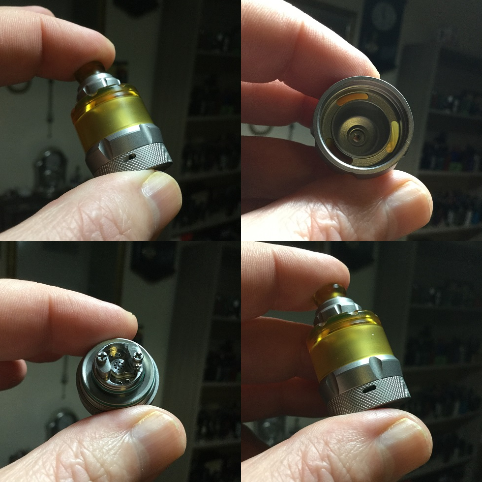 The section which accommodates your 510 drip-tip also unscrews to reveal 3 fill port holes rather than slots. Looking at them although obviously air can escape from the holes not being occupied by your nozzle it does look like filling will need to be done very carefully else it could get messy. Fair enough you can't use droppers or thick nozzles but standard gorilla nozzles are fine. The holes are actually slanted and filling surprised me as it could be done quickly and mess free, much better than it looks!