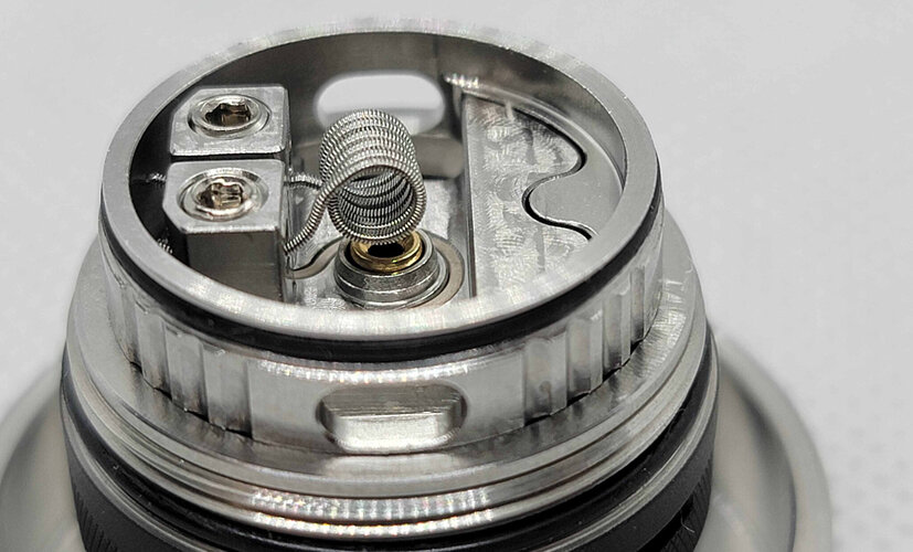 With the deck ring removed, coil insertion, manipulation, and trimming couldn't have been easier. Notice the puzzle piece keying on the left of the deck, so the deck ring could be re-inserted correctly, and the wick tail / juice wells ....
