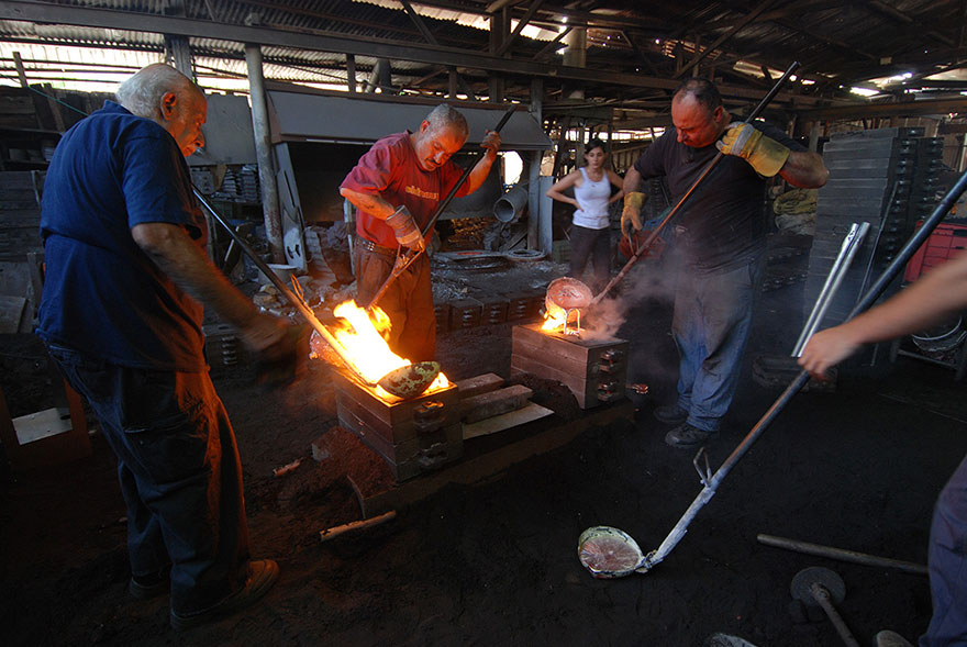 To create these unprecedented pieces, Shamia poured molten aluminum onto logs of raw cypress and eucalyptus that have been cut lengthwise. The burning of the molten aluminum on the surface of the raw wooden log creates a beautiful black layer of carbon that creates a boundary between the cold silvery color of the aluminum and the wood’s beautiful natural colors and forms. Because the aluminum is molten, it runs into every crack and crevice of the wood, creating a strong bond and a striking appearance.
